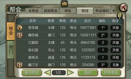 即可点击全体发送,仅有帮主和副帮主点击【全员发送】按钮、能够依照为全帮众组织人员以及部队的分配帮众能够提早和帮主商议好所希望与那位兄弟一同参战。