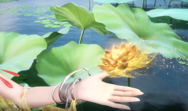 身侧金鲤戏水指尖流动的仙音与莲瓣飘落的簌簌声交织成韵
