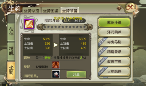 本次新版本還將新增兩個全新坐騎配備:【匿蹤大氅】、【澤閏葫蘆】。【匿蹤大氅】可供給土特點進犯和防護加成,並具有【下坐騎後隱身三秒】的特殊效果。 讓玩家在战役中更添新技能而且大獲全勝!而 【澤閏葫蘆】就為玩家供給的是木特點進犯和防護加成,【下坐騎後5秒內回復自身30%的生命值】的特殊效果如虎添翼。 玩家可在战役中使用此坐騎配備迅速回血,暢享勝利果實!【匿蹤大氅】獲取方法為商城購買,【澤閏葫蘆】獲取方法為運營活動,心動的玩家請持續關註哦。
