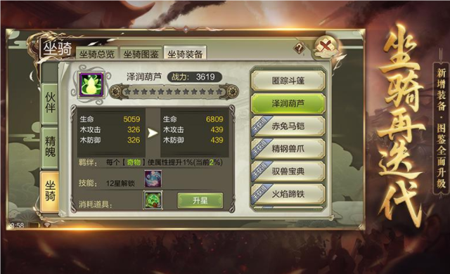 不光如此,玩家在新服中提升等級也將取得豐盛的奢華獎賞,新服敞開前七天晉級加速,玩家將最快取得更多獎賞!在本次更新中,遊戲將優化主要界面美術! 战役特效、技術特效愈加契合視覺審美,玩家在战役中視覺不易疲憊,愈加優質的畫面讓體驗感晉級!武魂八卦再次添加金木新元素!武魂新增藍色、紫色。 橙色金、木元素特點的命格,八卦新增金木特點的八卦命格,本次將近壹年的坐騎新增入圖鑒收集中,還進行了分類整理的界面優化,愈加壹目了然。而且新增特殊效果坐騎“匿蹤斗篷”“澤閏葫蘆”,獲取方式敬請期待!